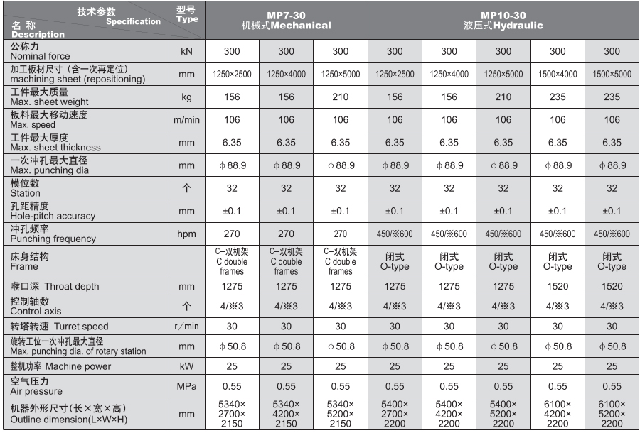 主机采用闭式宽机身结构,壁炉回火去应力处理,稳定性好;流线型外形弧形设计,动感美观;侧面定位、镶套结构厚转塔,定位精确、导向好、精度高;间隙可调式蜗轮蜗杆机构旋转工位,精度高;伺服电机以及曲柄连杆主传动机构,性能稳定,高速静音,节能环保;日本FANUC Oip专用数控系统,功能强、操作简便;高速静音大导程丝杠、直线导轨,国际化配套的气动和电气元件,高性能全自动浮动夹钳,钢球毛刷结构不锈钢工作台。
